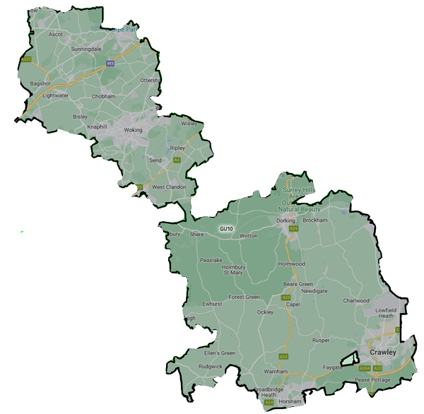 Ascot, Bagshot, Bisley, Brockham, Capel, Charlwood, Crawley, Faygate, Lightwater, Lowfield Heath, Ottershaw, Ripley, Send, Sunningdale, Virginia Waters, West Clandon, Woking and surrounding areas